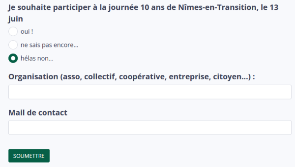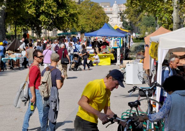 Nîmes-en-Transition vous propose la date du samedi 13 juin pour nous retrouver sur le parvis de l’avenue Feuchères. Comme il y a dix ans, chaque structure vient avec ses bénévoles et son petit matériel, Nîmes-en-Transition s’occupe du reste (autorisations mairie, tables, chaises, grilles, branchements…)