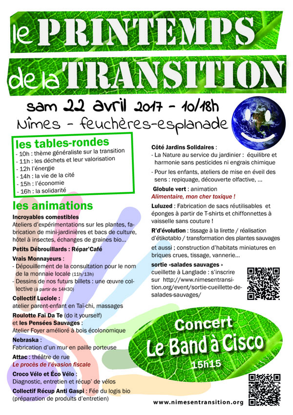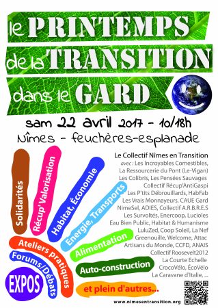 Une fois par an, parfois deux, une grosse vingtaine d’associations se regrouperont sous la bannière « Nîmes-en-Transition » pour une journée sur l’Esplanade ou sur Feuchères afin d’y rencontrer un public de passage, de proposer diverses animations, d’échanger à l’occasion de mini-débats et tables-rondes. C’est la crise sanitaire de 2020/21, avec son cortège de « distanciation sociale » qui mettra fin à la régularité de cette initiative.