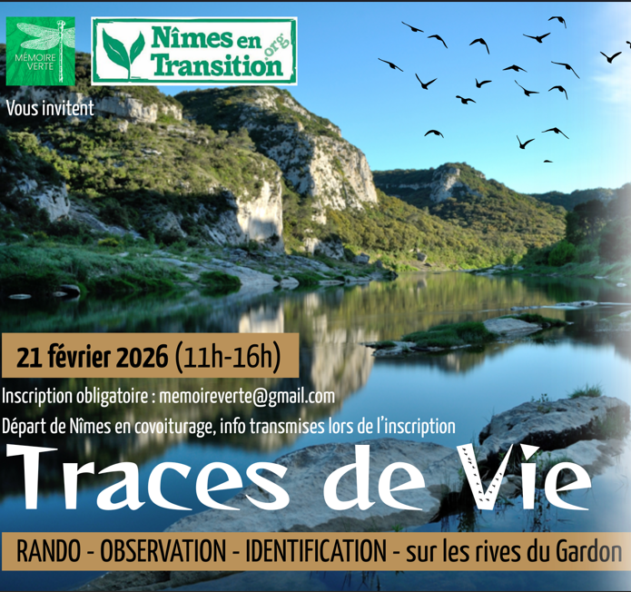 RANDO-RECHERCHE-OBSERVATION-IDENTIFICATIONTraces de Vie le samedi 21 février 🕥 Rendez-vous parking Paloma Nîmes-Courbessac à 10h40 🚌 Accès par Tango T2 ou T4(au départ de Gare Feuchères) T2 : 10h04-10h23 T4 : 10h14-10h31 Départ 10h50 après organisation du covoiturage 🚐 Inscription obligatoire : memoireverte@gmail.com Le point de départ de la marche se situe sur le plateau Poulx-Cabrières surplombant les Gorges du Gardon. 45 mn de marche en descente nous mèneront au bord du Gardon par un vallon peu fréquenté (dénivelé 170 m, par un sentier sans grande difficulté mais demandant une certaine aisance à la marche)Au cours de la descente et une fois sur... Lire l'articleRando-activité Traces de vie |