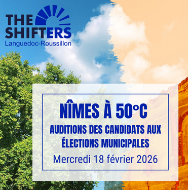 Les Shifters du Gard organisent une audition des candidats à l'élection municipale de Nîmes sur les thèmes énergie-climat. Les candidat·es exposeront leurs réponses à des questions préparées et communiquées à l'avance par les Shifters. Chacun·e exprimera sa vision et ses convictions pour la ville de Nîmes et Nîmes-Métropole. La soirée sera animée par Estelle Pereira, journaliste indépendante (ReporTerre, ...) Objectif : donner à voir les propositions des candidat·es sur les enjeux énergie-climat. Comme Nîmes-en-Transition, les Shifters sont apartisans et veillent à l'égalité de traitement des candidats.
